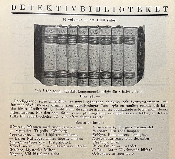 | Stein Riverton: Mannen med tusen järn i elden* / Stein Riverton: Mysteriet Tripolis–Göteborg* Gösta Palmcrantz: Trumf i hjärter, madame!* / Gösta Palmcrantz: Baron Nattvogel vinner högsta vinsten* S. A. Duse & Axel Klinckowström: Pistolskottet* / Axel Klinckowström: De nio fakirernas harem* Edgar Wallace: Mysteriet Milton* / Hildemar G:son Hogner: Vid kärlekens eldar* Øvre Richter-Frich: Det gula dokumentet* / Mary Roberts Rinehart: Den röda lampan* Victor Bridges: Röda husets hemlighet* / Gösta Rybrant: En sensation i december* H. de Vere Stacpoole: Tuan* / Percival Christopher Wren: Ormen och svärdet* Rock Pelham: Baron Ulvehuvuds bilfärd* / Isabel Ostrander: Intrigernas ö* |