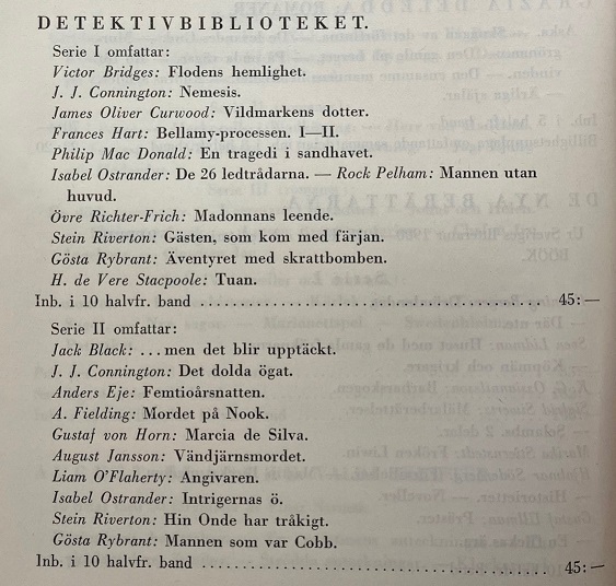 | Serie I: Victor Bridges: Flodens hemlighet* J. J. Connington: Nemesis James Oliver Curwood: Vildmarkens dotter* Frances Hart: Bellamy-processen I-II Philip MacDonald: En tragedi i sandhavet Isabel Ostrander: De tjugosex ledtrådarna* / Rock Pelham: Mannen utan huvud* Övre Richter Frich: Madonnans leende* Stein Riverton: Gästen, som kom med färjan* Gösta Rybrant: Äventyret med skrattbomben* H. de Vere Stacpoole: Tuan* | Serie II: Jack Black: ... men det blir upptäckt* J. J. Connington: Det dolda ögat Anders Eje: Femtioårsnatten* A. Fielding: Mordet på Nook* Gustaf von Horn: Marcia de Silva* August Jansson: Vändjärnsmordet Liam O'Flaherty: Angivaren* Isabel Ostrander: Intrigernas ö* Stein Riverton: Hin Onde har tråkigt* Gösta Rybrant: Mannen som var Cobb* |